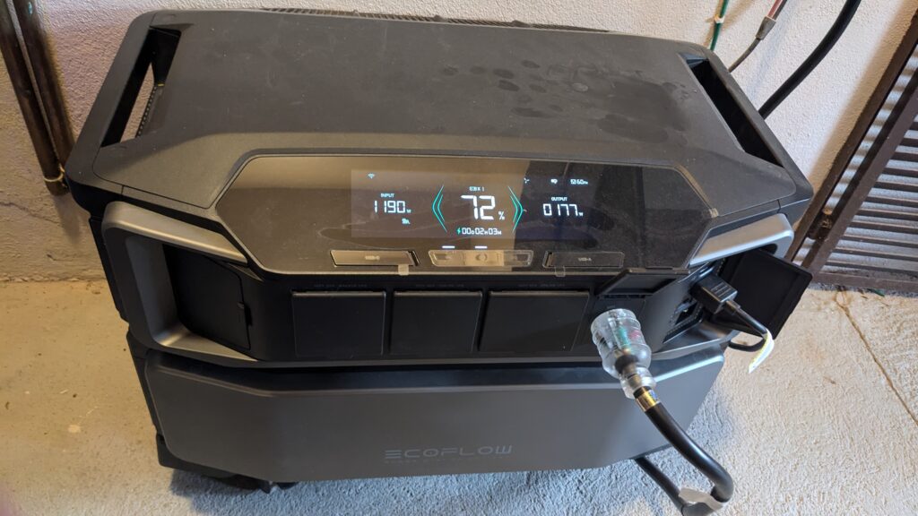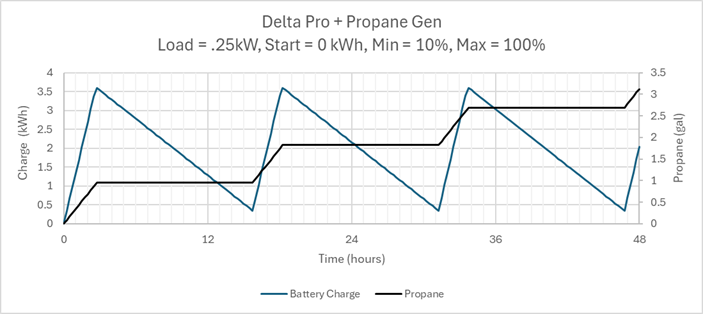 Ecoflow sells an inverter type smart propane generator that is controlled by the Ecoflow Delta Pro battery system. The propane generator is designed to supply the maximum charging power of 1.6 kW to the battery when the charge reaches a preset level and to turn off when the charge reaches another preset. Both of these levels are user controllable, but they would typically be set around 10% and 100%. With the battery initially fully discharged, the charging/discharging profile looks like the graph below. The propane usage is 2.7 gal in 47 hours or 1.3 gal per day – about the same as the propane generator without battery (as would be expected). However, the generator does not run all the time, so the noise is reduced.