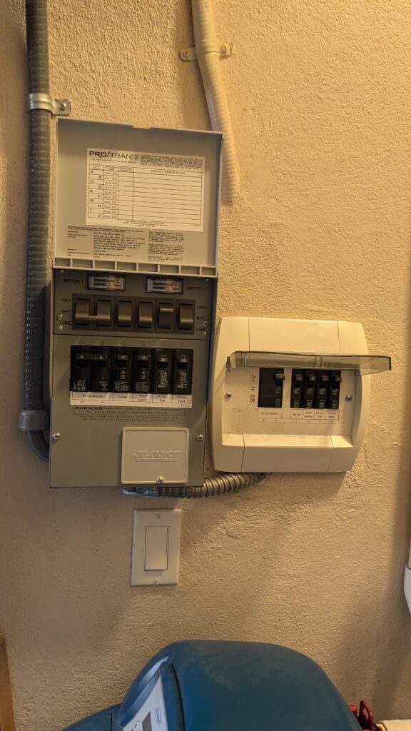 As an example of what the selected solar/battery backup system looks like installed, see the home page for a picture of the solar panels, and the following three photos showing the inverter/battery system, the DC surge protector/circuit breaker, and the transfer switch next to the sub-panel.