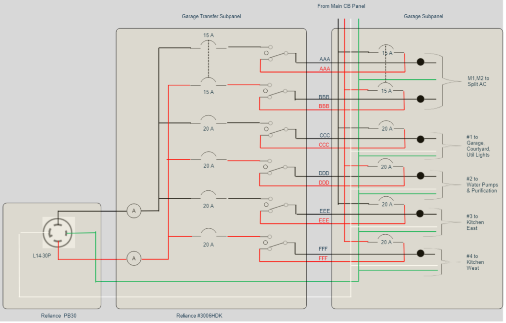 Whether connected to a sub-panel or the main entry, the backup system MUST be isolated from the CFE wiring using a transfer switch. In my case, the survival circuits are all located in the garage sub-panel, so this panel can be connected to a 6-circuit transfer switch as shown below.