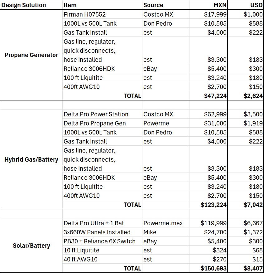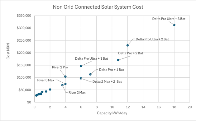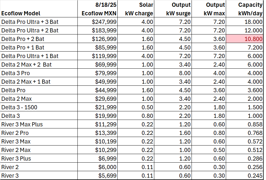 For a number of factors including portability, cost, and availability in Mexico, the Ecoflow generators were considered. Some of the more promising models are listed below. Prices were obtained from the PowerMe website in Monterrey in August 2025.