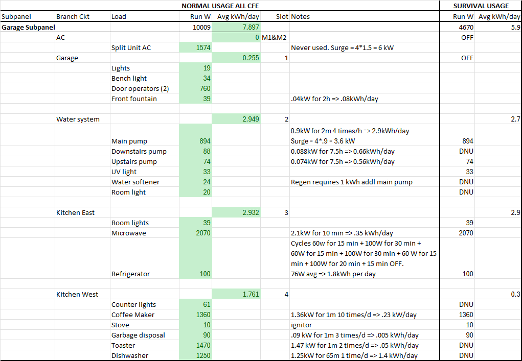 The measured power and energy for normal usage are highlighted in green. For survival, three of the six circuits are set to OFF, and a number of appliances are marked as Do Not Use (DNU). The other two sub-panels are not used at all during backup (survival) mode, but they were similarly measured and totaled to get the total power and energy consumption for the entire house.