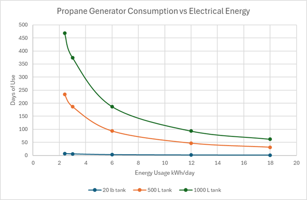This graph shows that for a 6 kWh per day load, the 1000 liter tank would last 6 months, the 500 liter tank 3 months and the 20 lb tank 3 days.