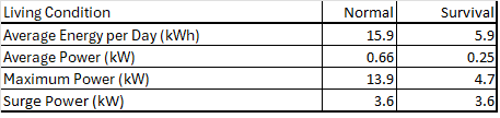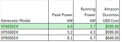 For survival operation, we need a peak power of 4.7 kW and an average or running power of 0.25 kW so the smallest generator listed would work fine, especially if the coffee maker and microwave are not used simultaneously.