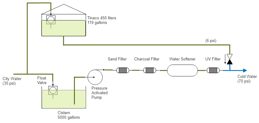 The figure below shows the connection between city water, cistern and tinaco. Note the check valve on the far right. Cistern and tinaco water are not purified. Filtering takes place after the pressure pump. Tinaco water does not pass through this path so it is not purified.
