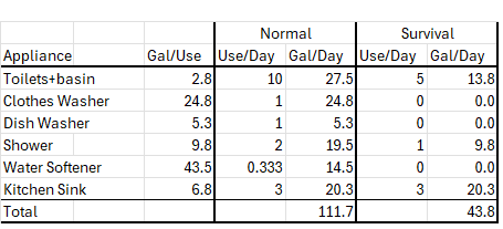 Estimate or measure the consumption of all water appliances in the house as described in Water Measurements. Then estimate the lower consumption that will occur under survival conditions. The results should look like the table below.
