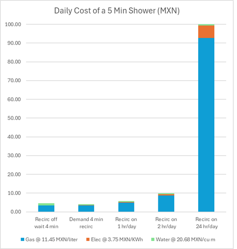 The second is that the cost for the convenience of never waiting for hot water is pretty high. It is 100 pesos per day (US$5) vs 4.49 pesos (US$0.22) for no recirculation and a four minute wait.