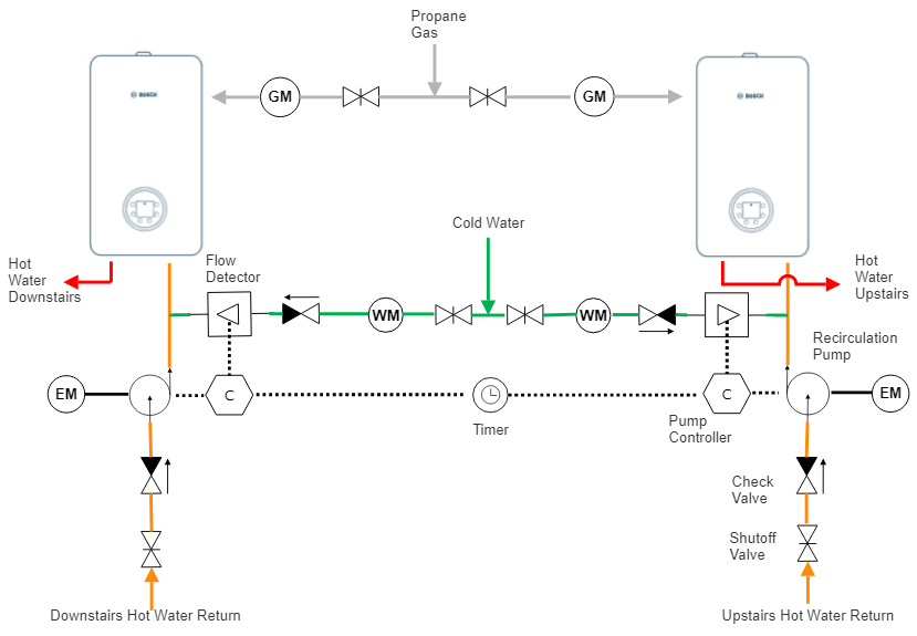 The above diagram shows propane gas lines with shutoff valves then gas meters connecting to the Bosch heaters. Actually, I have only one meter, but it can be connected inline to either the upstairs or downstairs heater.