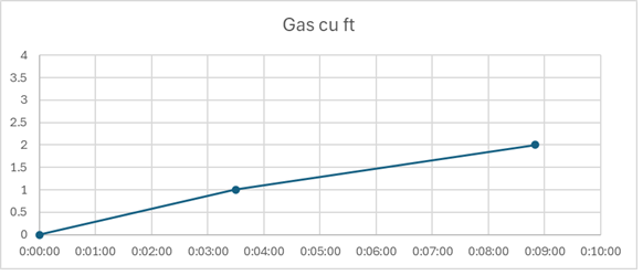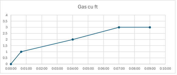 The readout resolution of the gas meter is only one cu ft, so the data is not as refined as might be desired. Overall, a total of three cu ft of gas was used. However the first two cu ft were used to heat the cement surrounding the gas pipes from the water heater to the shower head, then another one cu ft was used to heat the water used for the five minute shower.