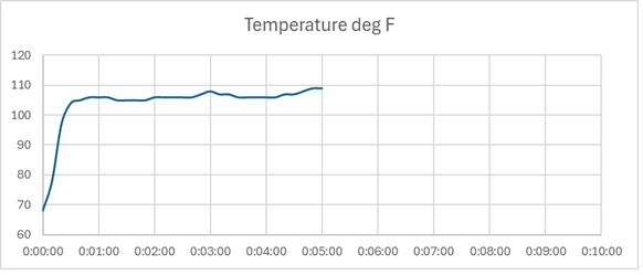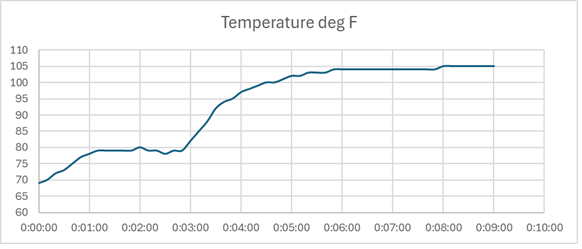 This test was performed in March when the normal daytime temperature is about 70 deg F. The water temperature flow starts at about 68 deg F. After a minute it reached 80 deg F, then between three and four minutes it increased to 95 deg. This is when the five minute shower began. The test ended at nine minutes.