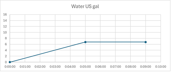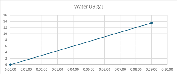The water flowed at a constant rate between zero and nine minutes with the total flow being 13.5 US gallons. 44% of this was wasted waiting for the temperature to reach 95 degrees.